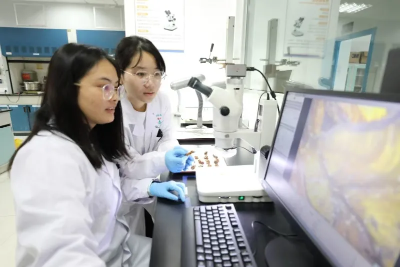 检验员用体式显微镜观察海洋中药材性状特征