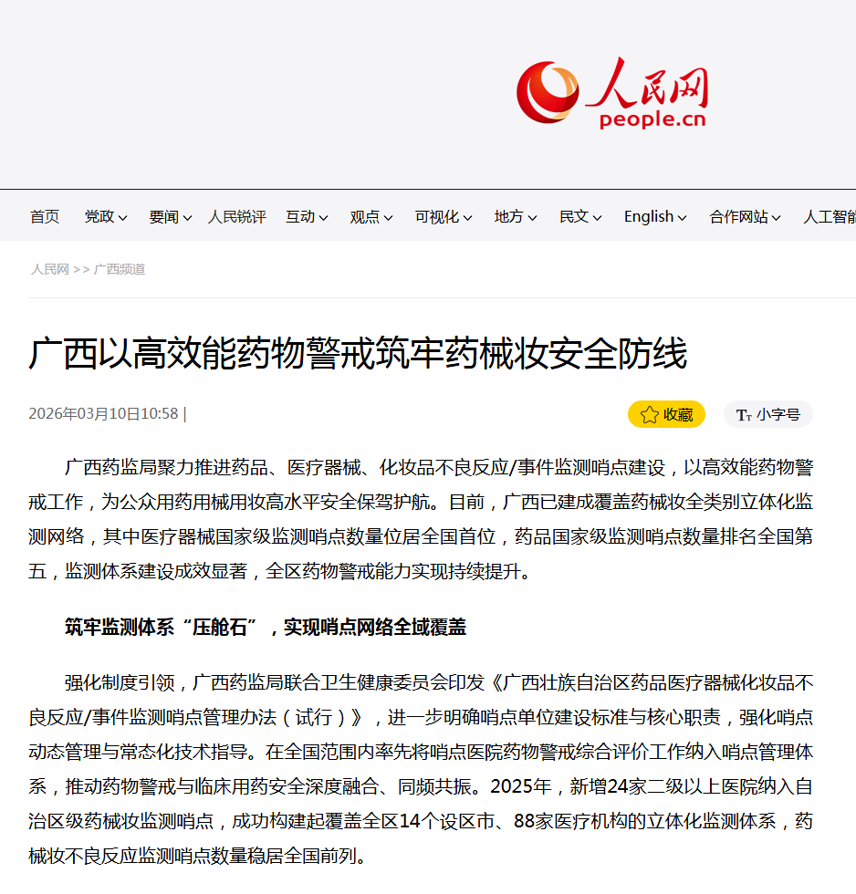 创新开发智能辅助上报系统,实现监测报告从收集、审核到上报的全环节数字化管理,有效破解以往报告程序繁琐、工作效率不高的行业难题。当前,广西药械妆不良反应报告数量排名前十的机构均为哨点医院,监测报告数量与质量连续多年保持稳步增长。药品不良反应新的和严重的报告占比、医疗器械不良反应严重报告占比、化妆品不良反应报告每百万人口报告数等核心指标,连续多年位居全国前列。2025年,全区已挖掘60余个药品不良反应风险信号,其中8个获国家药监局认可,同时高质量完成国家中心部署的7个品种安全性再评估工作,为相关药品说明书修订提供了重要科学依据。