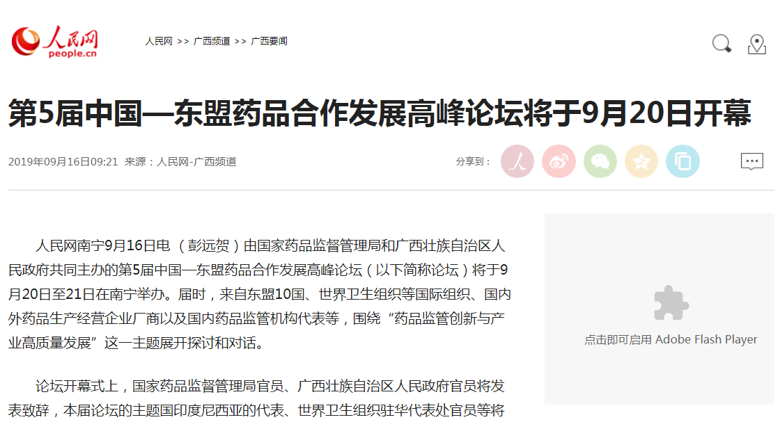 人民网:第5届中国—东盟药品合作发展高峰论坛将于9月20日开幕