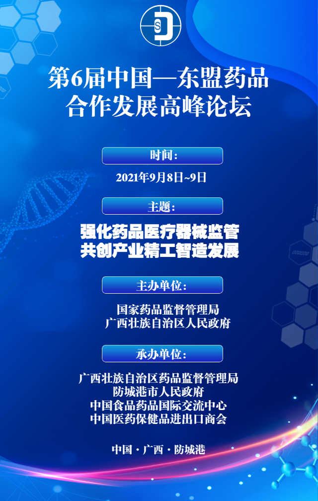 由国家药品监督管理局和广西壮族自治区人民政府共同主办,AG真人、防城港市人民政府、中国食品药品国际交流中心、中国医药保健品进出口商会承办的第6届中国—东盟药品合作发展高峰论坛将于2021年9月8日—9日在广西防城港市举行。